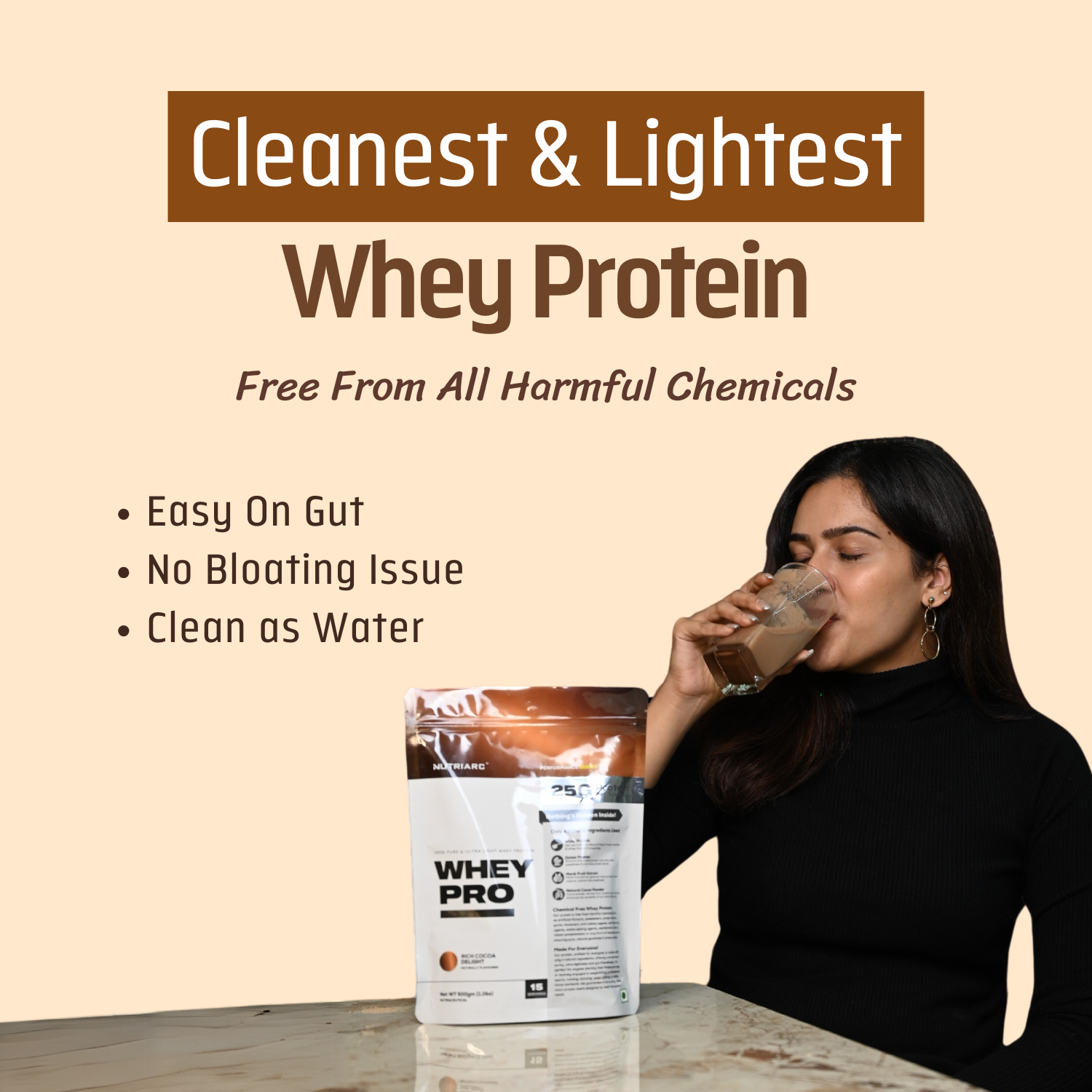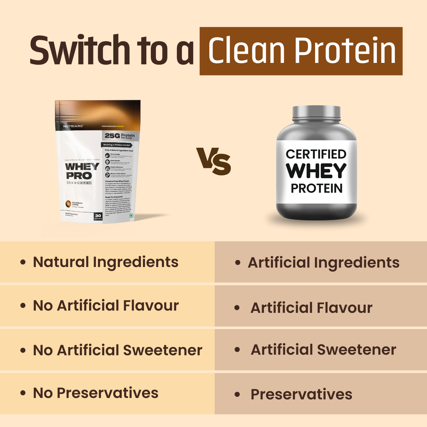 > In our Naturally flavored variants like Rich Cocoa Delight and Colombian Coffee, Whey Pro Isolate protein is predominantly sourced from Whey Protein Isolate (>50%) combined with Whey Protein Concentrate to maximize protein content. Both isolates and concentrates are sourced from Grass Fed Cows Milk, ensuring natural and high-quality protein sourcing.