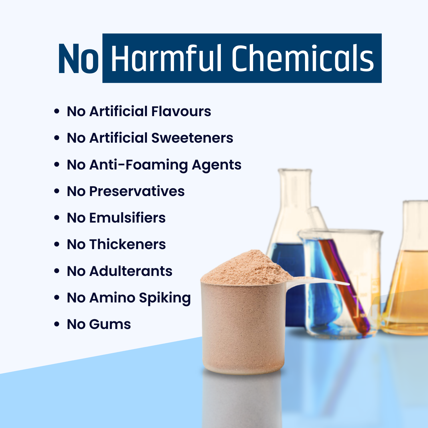 Our whey protein is free from all chemicals commonly used by other brands, such as preservatives, artificial flavors, sweeteners, thickeners, gums, anti-foaming agents, anti-caking agents, and emulsifiers. We use only completely natural ingredients, ensuring a pure, chemical-free protein.